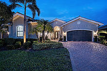 A captivating lake view awaits behind the gated courtyard of this elegant, coastal-inspired estate home. The coveted Carlyle floor plan is entertainer's dream, featuring an open layout where the wet bar, great room, dining area and kitchen all flow seamlessly to the outdoors. Live like you are on vacation every day in the large screened lanai with travertine marble deck and gorgeous saltwater pool & spa, accented with colored tiles that sparkle like gems, LED lights and waterfall features. Thoughtfully crafted and meticulously maintained, no detail has been overlooked, so you can move right into this fully furnished home. The gourmet model view kitchen, with center island, abundant level V white cabinets, ambient lighting, vented hood, new Bosch refrigerator, granite counters and glass tile backsplash, is simply stunning. Enjoy the lake view from luxurious primary suite, which features a spa-like bath. The unique Club Room is versatile, working well as an office, guest space or home theater. The two guest suites each have walk-in closets and their own full bathrooms, plus there is an additional “pool bath” off the great room. Luxurious appointments include 24” porcelain tile flooring throughout, crown molding, marble countertops in bathrooms, decorator lighting & fans, and custom window treatments including motorized shades. It’s easy to stay organized with California Closets throughout, and the laundry room includes a long folding counter, ample cabinets, a sink and new W/D. Two newer A/C units will keep you cool even on the warmest SWFL days. Easy to maintain flooring nicely finishes the garage. Additionally, the exterior was freshly painted in 2023. Located in Riverstone, a social, vacation-inspired community zoned for "A" rated schools. Recreation area includes a fitness center, social hall, resort & lap pools, spa, 5 Har-Tru tennis courts, basketball & pickleball court, tot lot and activities coordinator. Now is the time to enjoy the Naples lifestyle you have been dreaming of.